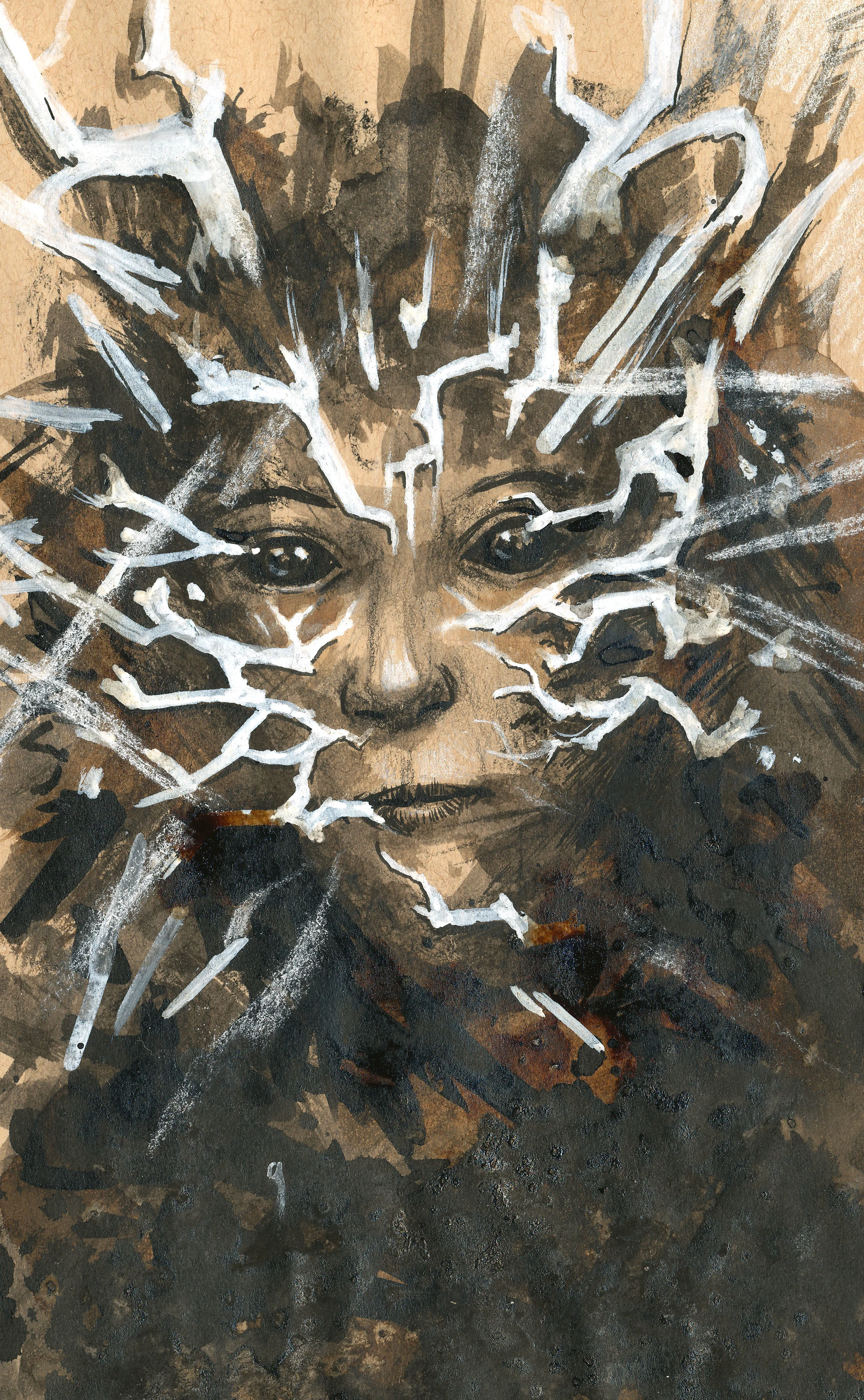 The first time I saw one of the afflicted it was moving sadly along the docks, the grey water reflecting its silhouette, the old bricks its shadow. Port Authorities cleared people out of its way. If you were touched, the process of forgetting would begin. A maze of branches would weave across your face like bones, bark and paint and strange cloth would coalesce around you. You would glide like an ancient creaking statue on hidden wheels. Your eyes would become dark, blank and distant. You would seek out your family so they could remind you of who you are. You would seek them the way water flows downhill or roots invade the earth, not because any part of you remembered them.
