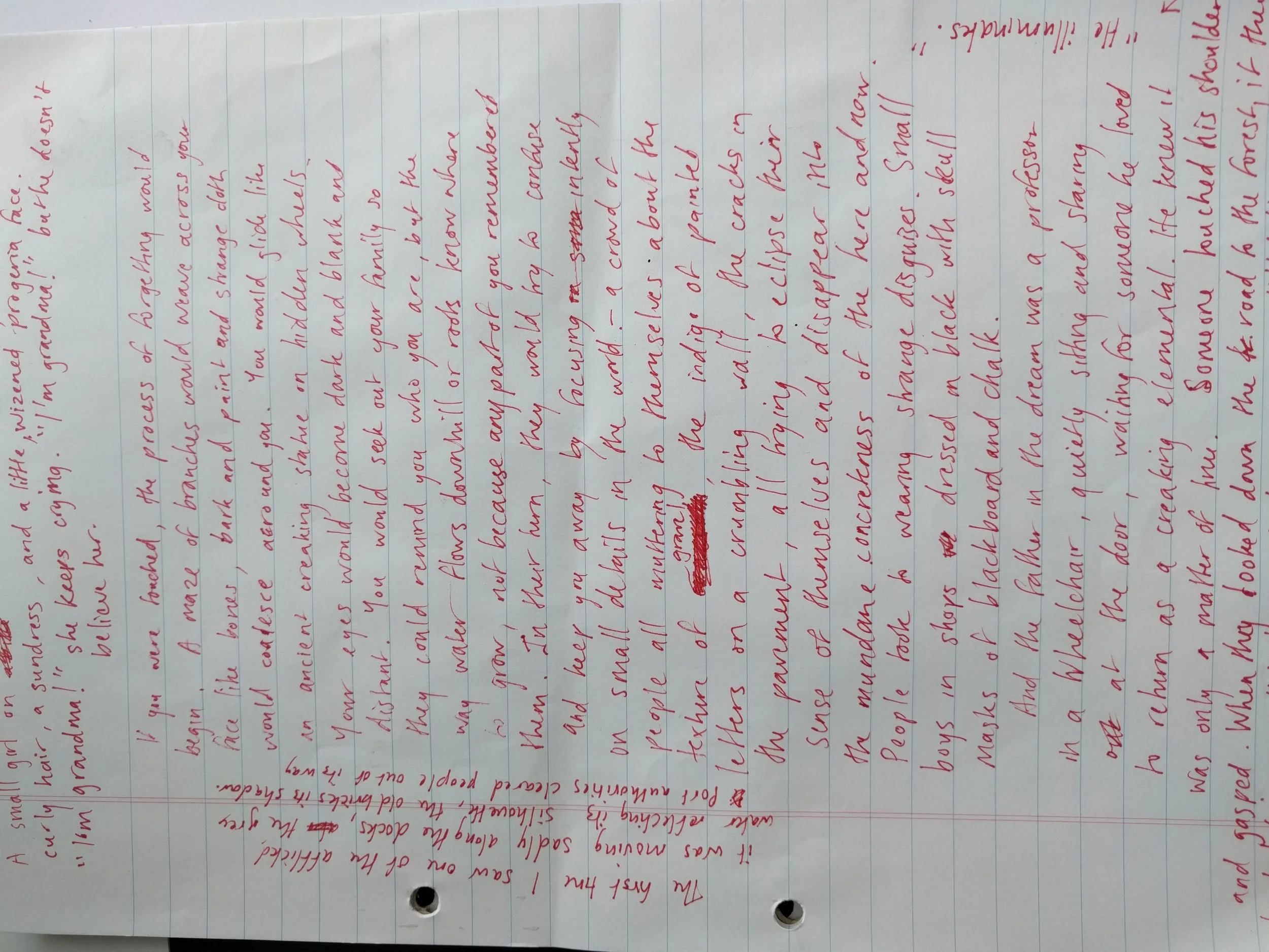 To protect themselves, they try to confuse you and keep you away by focusing intently on small details in the world - a crowd of people in the streets muttering to themselves about the texture of gravel, the indigo of painted letters on a crumbling wall, the cracks in the pavement, all trying to eclipse themselves and disappear into the mundane concreteness of the here and now. To protect themselves, people begin to wear strange disguises. Boys in shops dressed in black, with skull masks of blackboard and chalk. A tiny girl on the handlebars of her dad's bike, curly hair, sundress, little wizened progeria face, cries "I'm Grandmother! I'm Grandmother!" desperately, insistently, but he doesn't believe her.